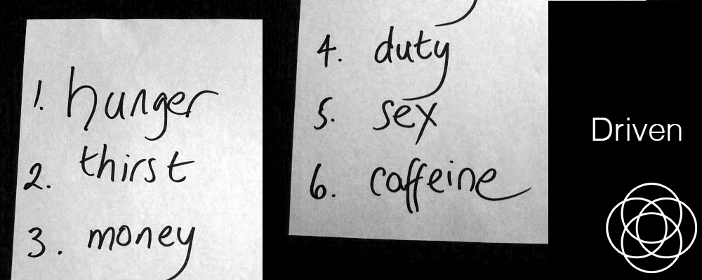 Before reading on, have a think about all the things that get you moving during a typical day. As well as some of the above, perhaps you are driven by love, sex, exercise, chocolate, alcohol, drugs, helping others, a need for order, curiosity, a wish to learn, friendship, self-improvement, high drama, a need to impress, to be right, to feel valued, to set a score, to atone, to hide, to be seen.